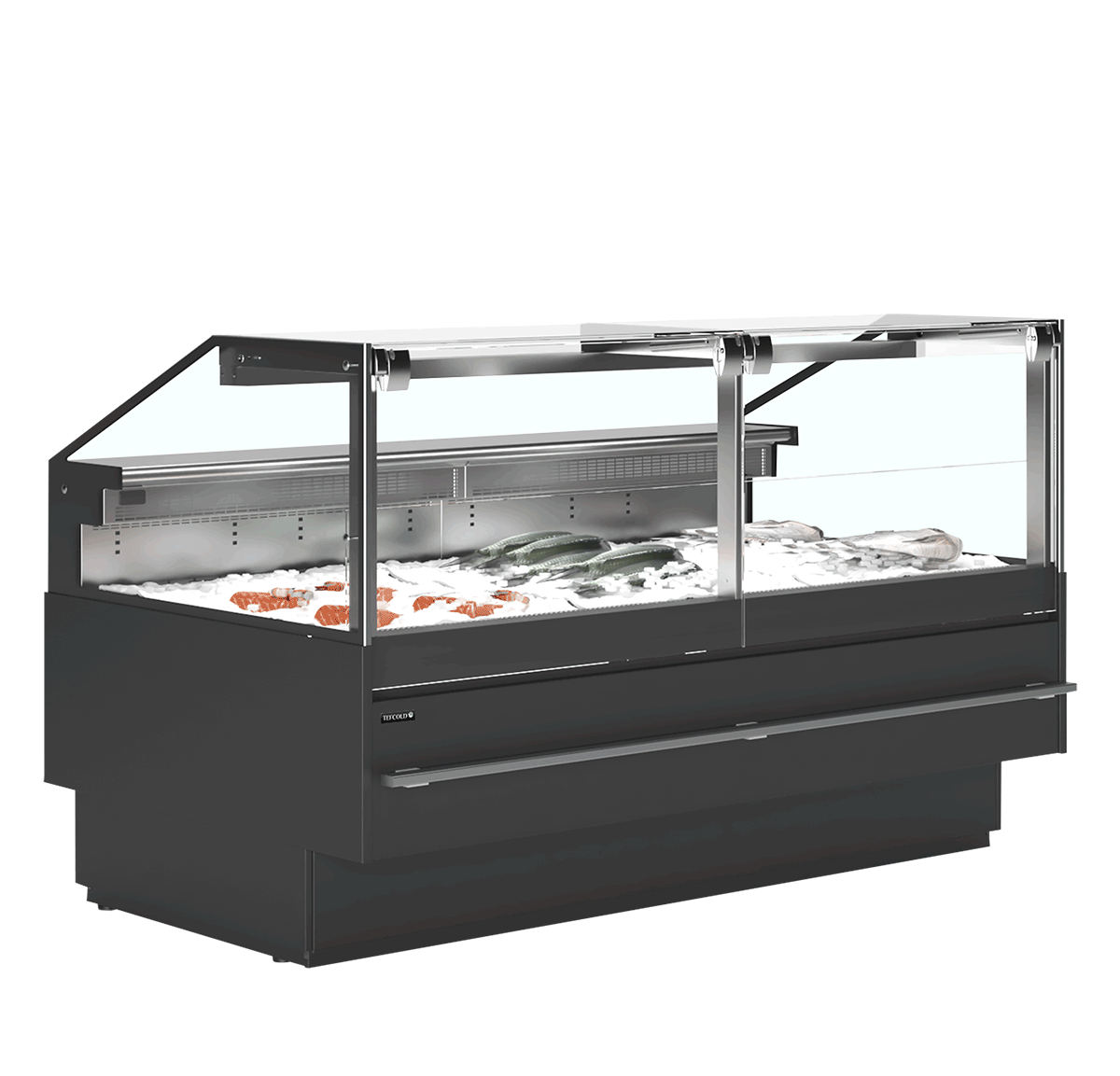 The SOCA-F range of serve over counters is designed specifically for displaying fresh fish on ice. The stainless steel deck in these units is therefore formed as a 50 mm deep tray to accomodate the ice. The front glass lifts up for easy cleaning and the glass is anti-mist. Customize with accessories and multiplex for a full counter solution.